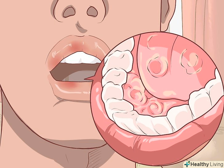 Визначте, чи немає у вас афтозного стоматиту.при афтозному стоматиті на слизовій оболонці ротової порожнини утворюються виразки, що призводить до постійного болю або хворобливих відчуттів під час їжі. Якщо виразки розташовані на яснах, вони можуть викликати біль в них. Ці виразки легко визначити: як правило, вони мають округлу форму з червоною або білою серединою.[1]- Лікарі не знають точних причин афтозного стоматиту. Іноді він пов'язаний з ушкодженнями ротової порожнини або вживанням їжі з підвищеною кислотністю. До стоматиту може привести і ослаблення імунної системи, і в цьому випадку він служить одним з перших ознак зниженого імунітету.