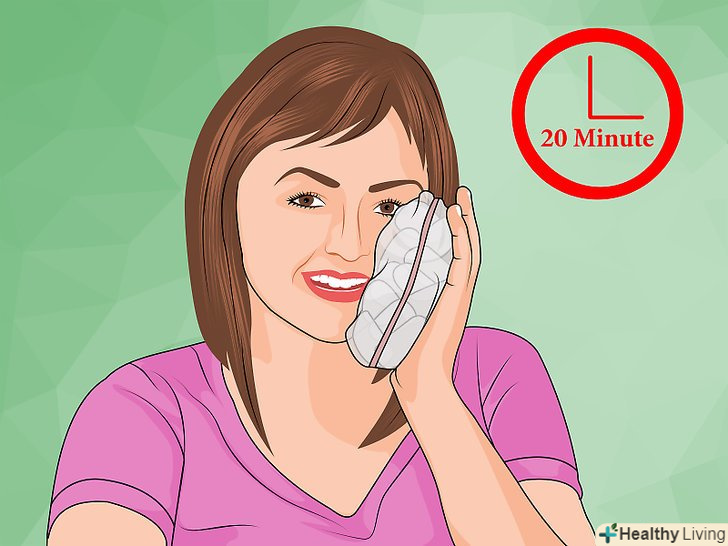 Прикладайте крижаний компрес.прикладіть лід, щоб вгамувати біль, набряк і синяк. Набряк досягне свого піку через 2-3 дні після операції, але його можна вгамувати, прикладаючи холодний компрес відразу після видалення зуба. Візьміть міхур з льодом або насипте лід в пакет на застібці і прикладіть його до того місця, де вам видалили зуб. Прикладайте і прибирайте компрес кожні 20 хвилин.[9]