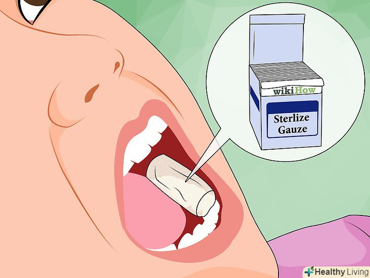 Зупиніть кровотечу.виділення крові з ділянки хірургічного втручання є однією з найбільш неприємних складових процесу видалення зуба мудрості. Залиште марлю всередині, щоб уберегти пошкоджену область, і регулярно її міняйте. Гарненько прикусіть марлю, щоб зупинити кровотечу, але не кусайте занадто сильно, щоб не стало боляче.[10]- Покладіть стерильну марлю на зуби і прикусіть її над місцем, де вам видалили зуб мудрості.