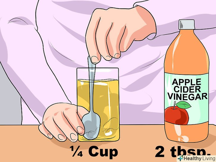 Приготуйте розчин для полоскання з яблучним оцтом.завдяки своїм антимікробним властивостям яблучний оцет використовується в багатьох народних засобах.[21] щоб приготувати розчин для полоскання, змішайте 30 мл (2 столові ложки) з ¼ склянки теплої води (приблизно 60 мл). Прополощіть рот протягом 30-60 секунд. Приділіть особливу увагу зубу з карієсом.[22]- Виплюньте розчин, після чого прополощіть ще два-три рази. Потім прополощіть рот теплою водою.
