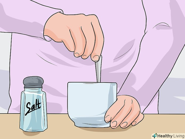 Прополощіть рот солоною водою.Одним з найбільш ефективних методів вгамувати біль у роті, є полоскання теплою солоною водою. Солона вода знижує кислотність в яснах, через яку може виникнути роздратування і біль.[7]- Розмішайте столову ложку (15 грам) солі в склянці теплої води або води кімнатної температури, поки сіль повністю не розчиниться. Прополощіть рот цим розчином, не забуваючи приділяти особливу увагу хворий яснах і зубу.