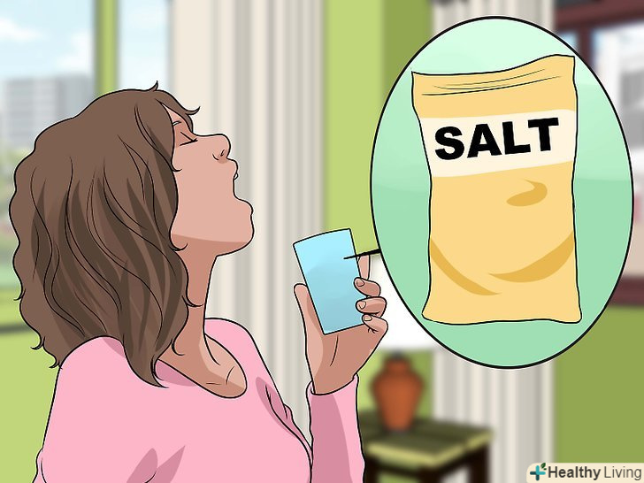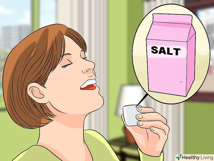 Приготуйте сольовий розчин для полоскання рота.полоскання рота солоною водою допомагає зняти почервоніння і запалення ясен, оскільки сольовий розчин очищає ротову порожнину і допомагає знищити шкідливі бактерії, які викликають відчуття дискомфорту. Просто додайте в стакан (250 мілілітрів) гарячої води чайну ложку (7 грамів) солі, перемішайте воду, щоб сіль розчинилася, і коли розчин досить охолоне і стане теплим, пополощіть їм рот.[5]- Не ковтайте солону воду. Після полоскання випльовуйте сольовий розчин.