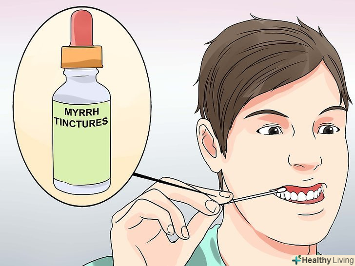 Приготуйте розчин для полоскання рота з настоянки мірри.Мірра надає заспокійливу дію на запалені тканини ротової порожнини.[8] крім того, мірру використовують для лікування фарингіту, тонзиліту, гінгівіту і виразок. Її розчин можна наносити прямо на помірно запалені ділянки ротової порожнини.- Мірра містить смолу, камедь і нелеткі масла. Її компоненти мають антимікробні властивості і позитивно впливають на роботу імунної системи за рахунок того, що стимулюють активність макрофагів (різновиди білих кров'яних тілець).