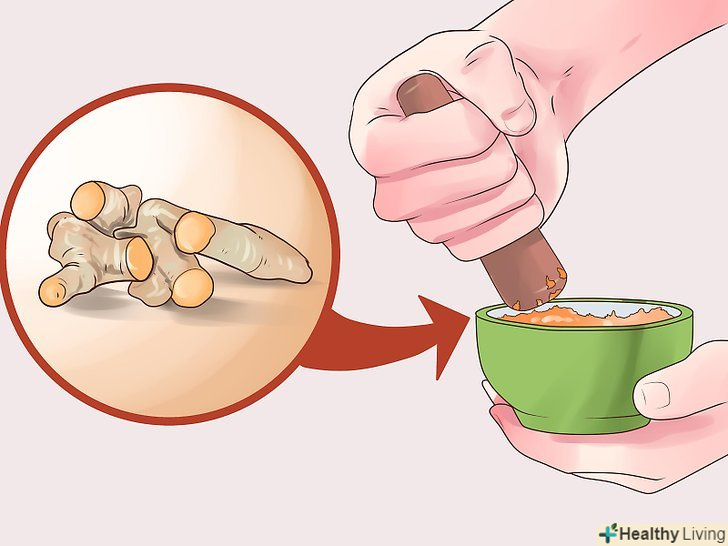 Полегшення болю за допомогою куркуми.куркума є не тільки ароматною спецією, використовуваної в кулінарії, але також була доведена її користь в медичних цілях. Куркума містить речовину куркумін, активний інгредієнт, що відповідає за зниження рівня гістаміну, який допомагає зменшити біль.[1]- У 250 грамах окропу розчиніть п'ять грамів куркуми, два зубчики часнику і два сухих листа гуави. Кип'ятіть суміш протягом 5 хвилин. Процідіть суміш через сито. Дайте охолонути, потім полощіть порожнину рота розчином куркуми протягом однієї хвилини, щоб полегшити біль.