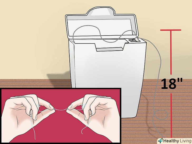 Намагайтеся відривати близько 40 сантиметрів нитки.оберніть ниткою кінчик середнього пальця правої руки і потягніть нитку, потім оберніть її навколо середнього пальця лівої руки. У вас повинно бути достатньо нитки, щоб схопитися за неї великими і вказівними пальцями обох рук.[13]