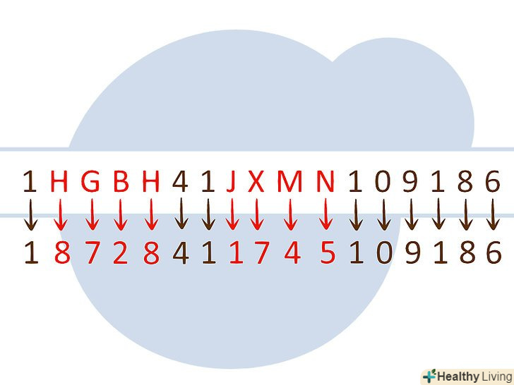 Замініть кожну букву VIN-коду цифрою згідно з наведеними нижче інструкціями.саме з цього все і почнеться. Головне на цьому етапі — не помилитися і записувати цифри в тому ж порядку, що і букви в коді.[9] наприклад, якщо ваш VIN-код починається так - AK6, то переписати його треба так — 126. Отже, правила заміни:- A і J-1