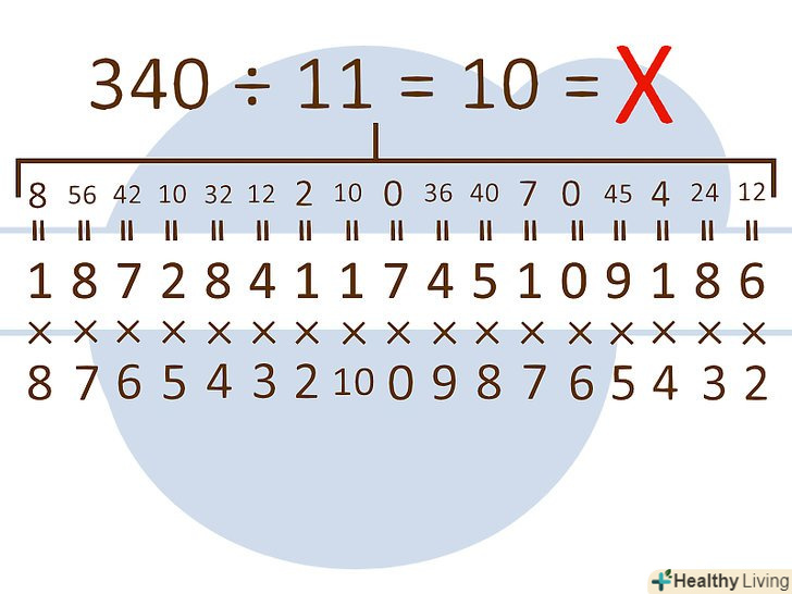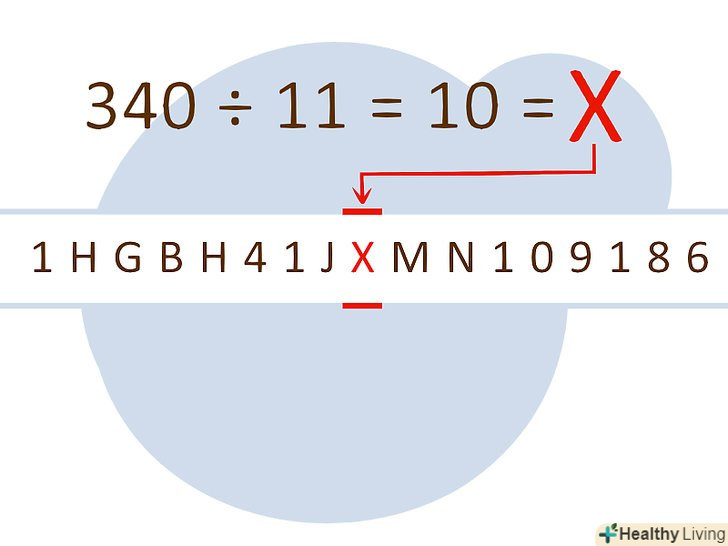 Розділіть результат на 11 і запишіть залишок.обчислювати дробову частину не треба, вистачить і цілої частини. Скористайтеся калькулятором або поділіть все в стовпчик. Втім, ніхто не заборонить вам обчислити все в розумі.- 'Примітка " : якщо залишок дорівнює "10", то запишіть "X".