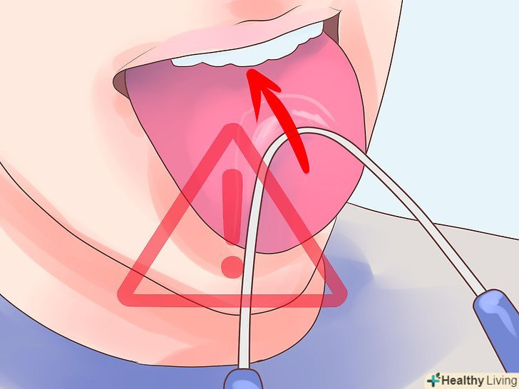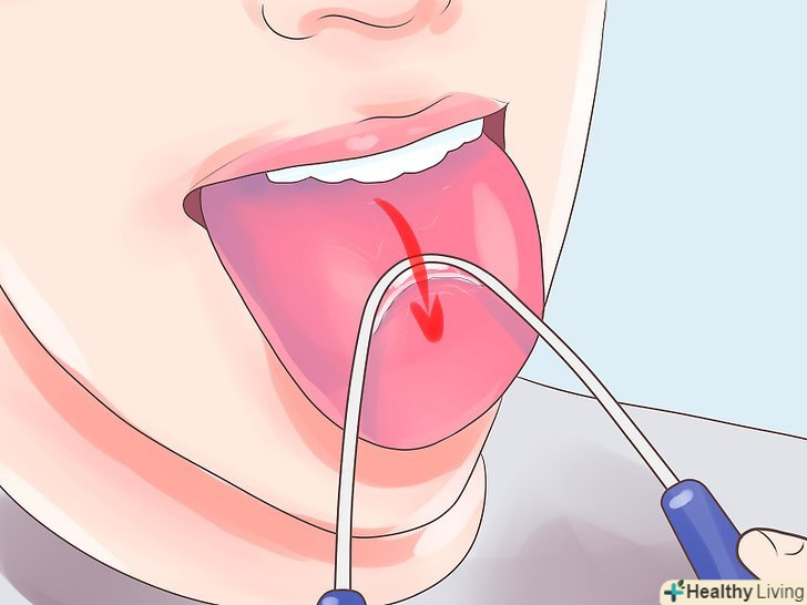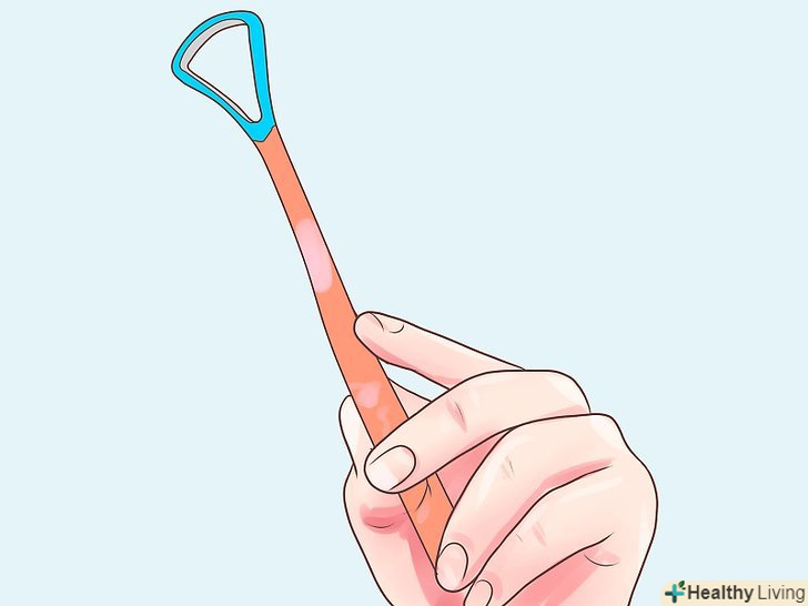 Візьміть скребок для язика за ручку і розмістіть його на задній частині язика.помістіть скребок на ваш язик, настільки далеко, наскільки можливо, щоб не виникало блювотний рефлекс. Те, наскільки далеко ви можете розмістити скребок в порожнині рота, залежить від фізіологічних особливостей кожної людини.