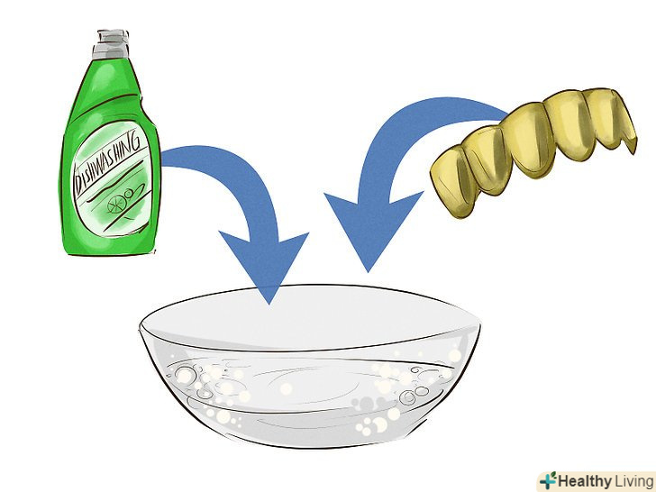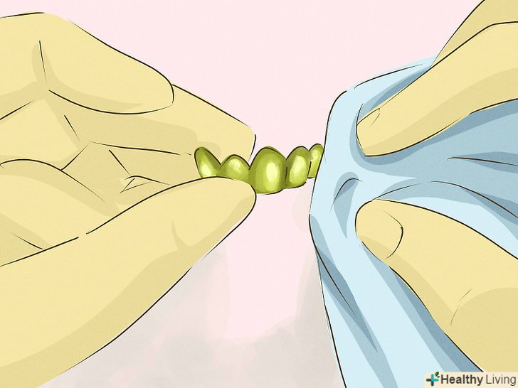 Використовуйте спеціальний засіб для чищення для знімних коронок.Знімні золоті коронки вимагають щоденного очищення. Використовуйте неабразивний засіб для чищення. Після очисти їх слід сполоснути в теплій воді і просушити.[6]- Стоматолог порадить вам відповідне засіб для чищення. Такі кошти можна придбати онлайн.