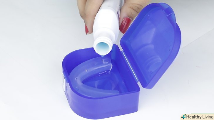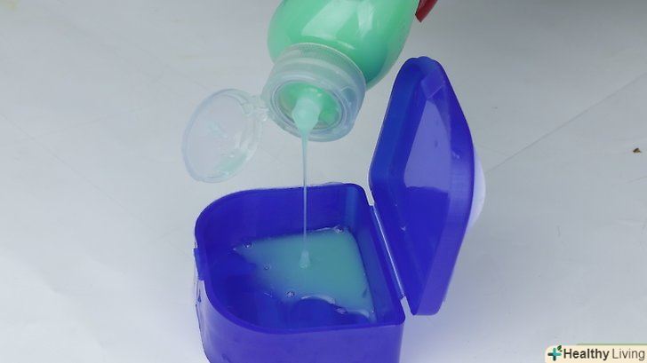 Купіть таблетки для чищення зубних протезів або ретейнерів.наповніть миску або ємність для чищення зубних протезів холодною водою з крана. Додайте в миску таблетку.[5]