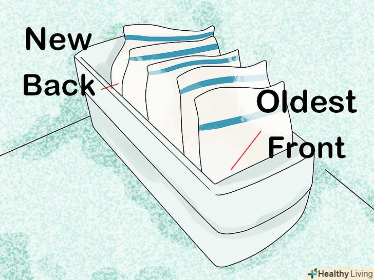 Тримайте найстаріше молоко ближче до передньої частини морозилки.нове молоко укладайте в дальню частину морозилки. Таким чином, перша взята з морозилки ємність завжди буде найстарішою.[3]