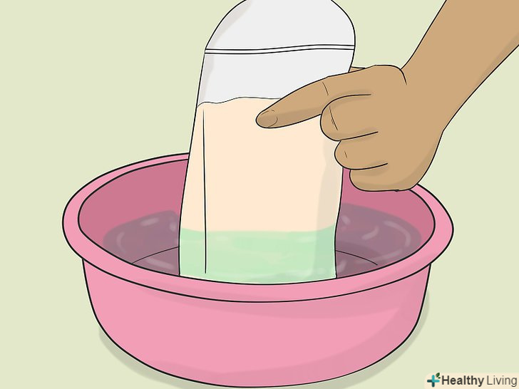 Занурте ємність із замороженим молоком в миску з холодною водою.попередньо переконайтеся, що ємність з грудним молоком герметична. Повністю занурте ємність з грудним молоком в миску або раковину, наповнену холодною водою, щоб рівномірно розморозити молоко.[7]
