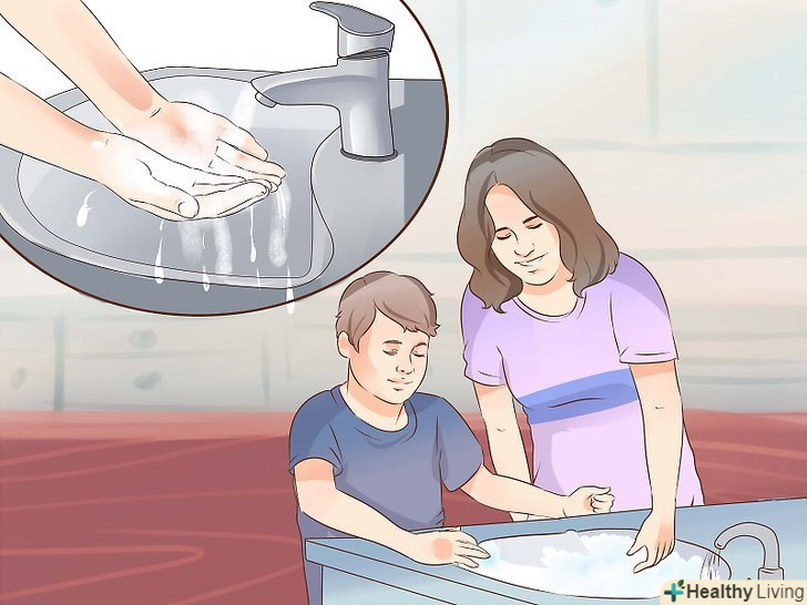 Привчіть свою дитину мити руки.це знизить небезпеку зараження грипом, а в разі захворювання зменшить ризик передачі інфекції іншим людям. Привчіть дитину мити руки перед їжею, після відвідування вбиральні і після того, як він висякається, відкашлюється або чхне. Навчіть дитину мити руки в наступній послідовності:[17]- Намочити руки під струменем води.
