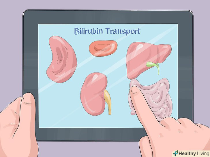 Знайте, як розвивається жовтяниця.зазвичай жовтяниця розвивається на другий або третій день життя і по одному зразку.- У здоровому організмі білірубін є нормальним побічним продуктом кровотоку при руйнуванні еритроцитів. Білірубін потрапляє в печінку, звідки виводиться через жовчні протоки, виходячи в кінцевому підсумку разом з калом. У новонароджених з жовтяницею печінка ще працює недостатньо ефективно, тому білірубін накопичується в печінці і в крові замість того, щоб виводитися через жовчні протоки.[9]