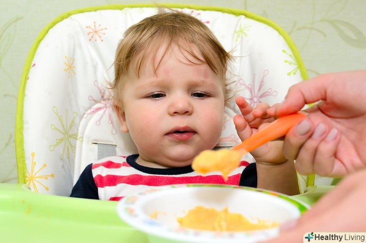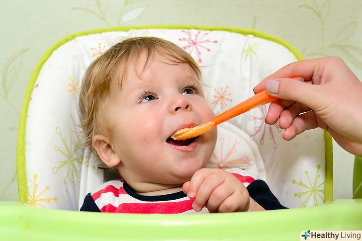 Дайте малюкові понюхати кашу перед їжею.діти більше покладаються на нюх, ніж на інші органи чуття.- Піднесіть повну ложку до носа малюка, дайте йому зрозуміти запах їжі. Виконайте це кілька разів на день, за 2-3 дні до початку прикорму. Незважаючи на те, що смак і структура їжі буде новою, знайомий запах допоможе з легкістю з'їсти кашу.