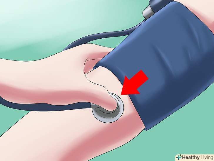 Помістіть стетоскоп нижче манжети.ви можете виміряти тиск, помістивши стетоскоп на руку нижче манжети, зазвичай на ліктьовий згин. У цьому місці проходить одна з головних артерій, що постачають кров'ю тканини передпліччя і кисті.- Якщо ви зможете при натисканні відчути пульсацію артерії, коли легко натискаєте вище ліктьового згину, це вам допоможе. Помістіть головку стетоскопа вище місця пульсації, акуратно притиснувши її.