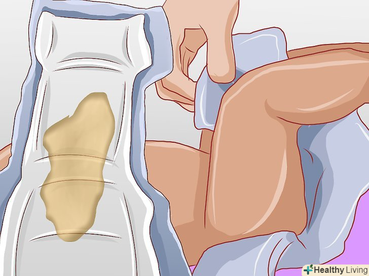 Зніміть брудний підгузник.розстебніть кнопки на тканинному підгузку або липучки на одноразовому підгузку. Розгорніть брудний підгузник і витягніть його з-під дитини. Притримайте при цьому дитину за ноги, щоб він випадково не потрапив ними в забруднений підгузник. Вам необхідно зробити так, щоб дитина залишилася максимально чистим і захищеним від бактерій.[34]