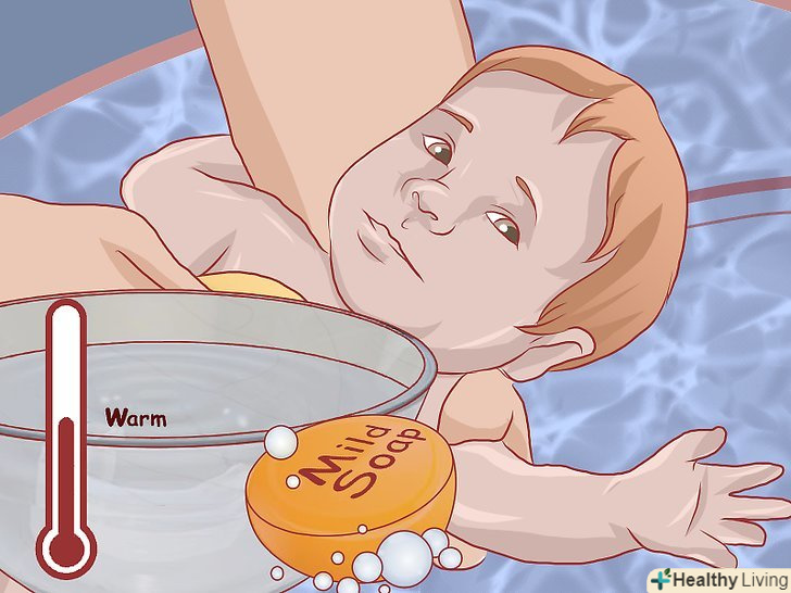 Підмийте дитину.у дитини з пелюшковим дерматитом буде дуже сира і чутлива шкіра. Проте, необхідно ретельно очистити цю шкіру, щоб вона могла нормально відновитися. Також важливо прибрати залишки старого крему, нанесеного в попередню зміну підгузника. Не використовуйте ароматизовані дитячі серветки або серветки з вмістом спирту. Кращим засобом очищення дитини з пелюшковим дерматитом є тепла вода. Якщо малюк сильно забруднився стільцем, то ви можете додатково скористатися щадним милом без запаху.[35]- Для підмивання дитини використовуйте пульверизатор з теплою водою. Це допоможе уникнути роздратування від тертя. Також ви можете на кілька хвилин посадити дитину попою в тазик з теплою водою. Це не тільки дозволить очистити попу, але і пом'якшить шкіру.[36]