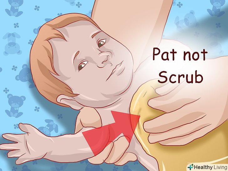 Промокніть вологу шкіру малюка рушником.взявши дуже м'який рушник, обережно промокніть їм вологу шкіру дитини. Не тріть шкіру, це може викликати ще більше роздратування. Волога живить бактерії, що викликають пелюшковий дерматит, тому дитина повинна бути максимально сухим.