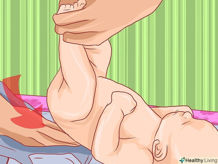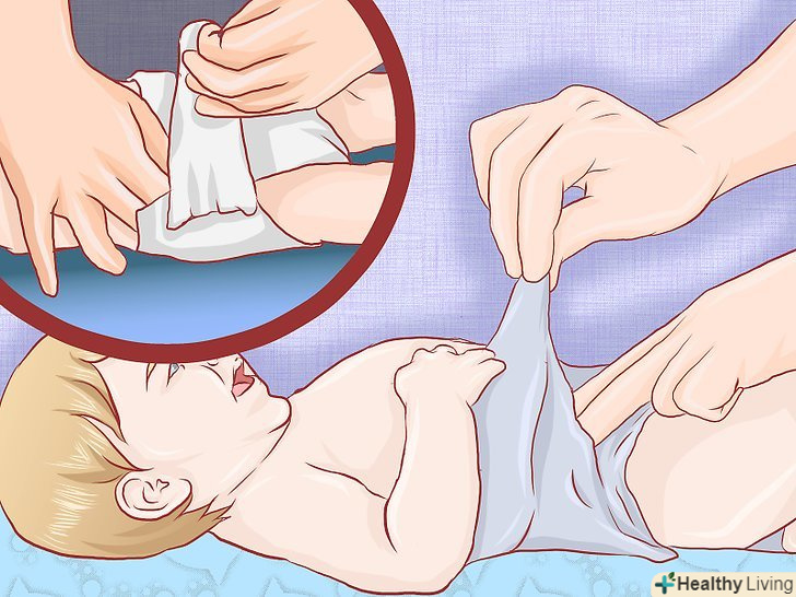 Підкладіть чистий підгузник під дитину.підготуйте новий підгузник до надягання на дитину. Підніміть малюкові ноги і підсуньте по нього підгузник. Розташуйте підгузник таким чином, щоб липучки виявилися на одному рівні з пупком.[39]- При серйозному пелюшковому дерматиті вам слід подумати про тимчасове використання підгузників більшого розміру (на кілька наступних днів). Просторий підгузник сприятиме припливу повітря і процесу відновлення шкіри, також він запобіжить накопиченню вологи.[40]