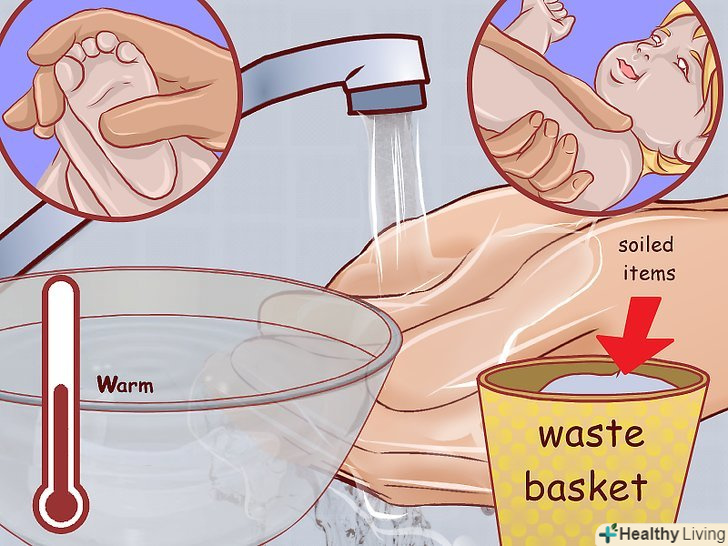 Приберіться.Так як пелюшковий дерматит частково викликається поширенням бактерій, після зміни підгузника вам слід прибратися. Одяг малюка, пеленальний стіл, ручки і ніжки дитини, ваші руки – все повинно бути ретельно вимито після контакту зі стільцем і сечею. Для миття своїх рук (і рук дитини) використовуйте теплу воду і мило. Належним чином викиньте брудний підгузник, а забруднений одяг відправте в прання.