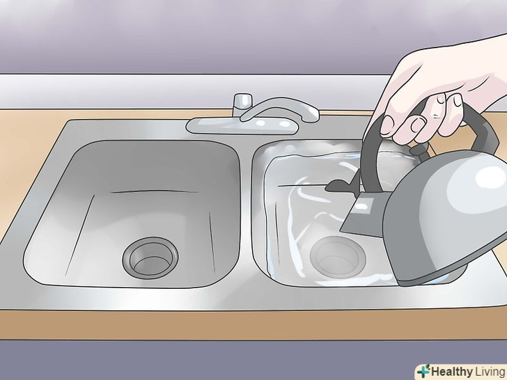 Сполосніть раковину і наповніть її гарячою мильною водою.перш ніж мити пляшечку, не завадить помити саму раковину, щоб усунути можливі бактерії і хімікати.- Скористайтеся жорсткою губкою, щоб відтерти стінки, дно і злив раковини гарячою водою. Якщо потрібно, скористайтеся харчовою содою або натуральним дезінфікуючим засобом.