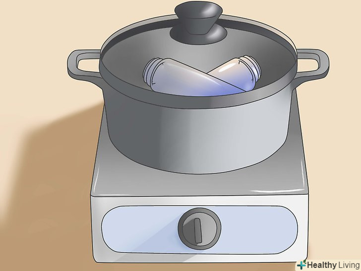 Простерилизуйте пляшечки в киплячій воді.старий спосіб стерилізації пляшечок-просте прогрівання їх в каструлі з киплячою водою.- Доведіть воду у великій каструлі до кипіння, киньте в неї частини пляшечки, накрийте кришкою і кип'ятіть мінімум три хвилини.