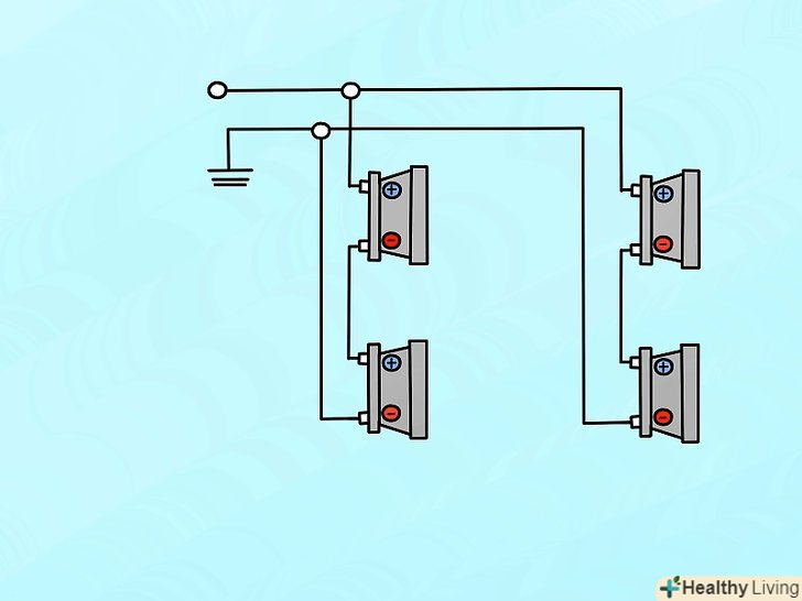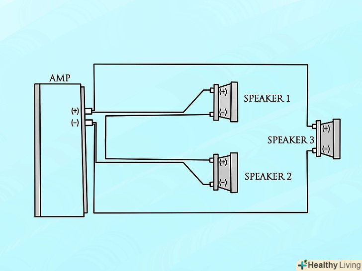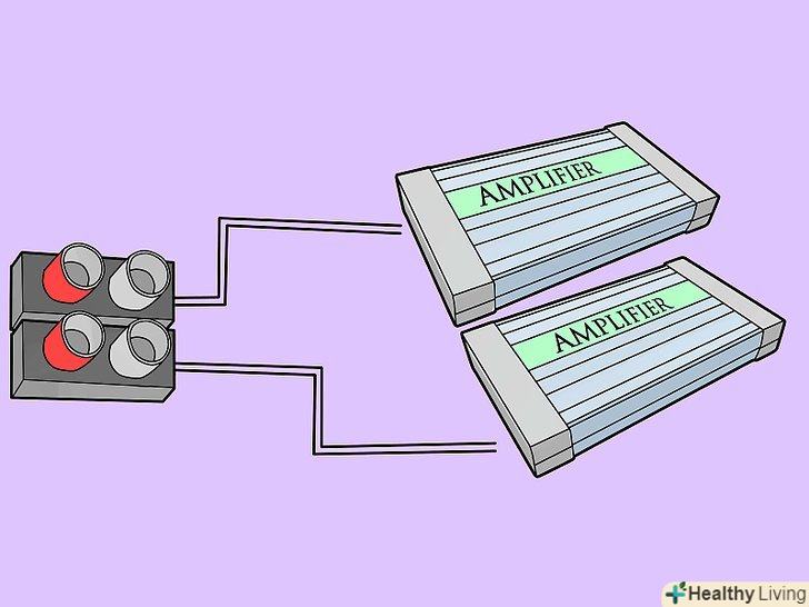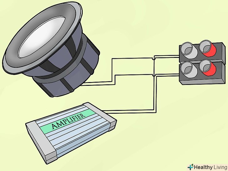 Підключіть всі НЧ динаміки до тих же клем на підсилювачі.однак, в залежності від того, як ви хочете їх підключити: в серію, паралельно або зробити міст від підсилювача, – можна використовувати тільки дві клеми. Для більш детальної інформації дивіться схему підсилювача.