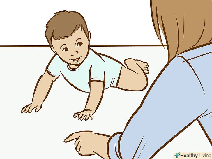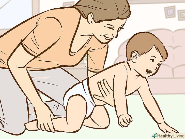 Нехай дитина повзе до вас.ви також можете відійти від нього на кілька сантиметрів, опуститися до нього і сказати: "Іди сюди! Іди до мами / тата!"Знову ж таки, якщо дитина засмутиться, підійдіть до нього, щоб не плакав. Таким чином, він захоче рухатися у напрямку до вас і переконається, що повзти і опускатися на карачки не так страшно. Він також може дивитися на Вас в дзеркало і наближатися, це ще один прекрасний спосіб підштовхувати дитину до руху вперед.- Коли малюк починає рухатися (але не повзати), підтримуйте його тулуб, тому що він крутиться в різні боки.