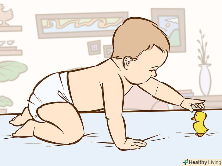 Дайте своєму малюкові можливість багато часу проводити на животику.дитині подобається грати лежачи на животі, і поклавши його в таке положення, ви дозволите йому досліджувати поверхню підлоги і своє тіло, що є основним у розвитку моторики і контролю голови, а також м'язів рук і шиї. Ви можете почати викладати малюка на животик якомога раніше, спочатку даючи йому полежати хвилинку-дві, що може здатися йому спочатку незручним. Коли малюк тільки починає пізнавати світ, лежати на животі йому буде не так комфортно, тому що. він не буде відчувати повний контроль над своїм тілом. Однак, даючи йому з перших місяців кожен день кілька хвилин лежати на животику, допоможе йому розвиватися і навчитися повзати швидкими темпами.[1]- У міру зростання дитини, у віці близько 4 місяців він може вже піднімати і тримати голівку, дивитися по сторонах і краще контролювати своє тіло. Це буде означати, що вже скоро він навчиться повзати.