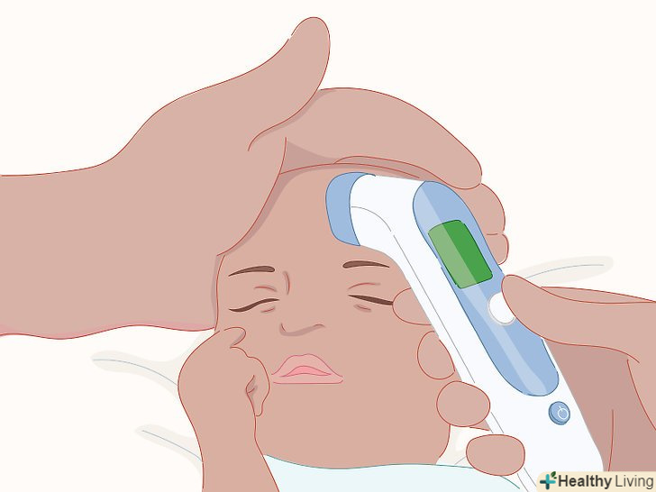 Перевірте температуру у дитини.Жар є невід'ємною ознакою того, що організм намагається перешкоджати розмноженню і поширенню патогенних мікроорганізмів (бактерій, вірусів, грибків), тому що більшість з них не можуть бурхливо відтворюватися при високій температурі. Таким чином жар є корисним фактором і хорошим індикатором того, що організм дитини бореться з хворобою. Виміряйте за допомогою градусника температуру у дитини. Температура 37,7°C або вище є типовою при наявності отиту (і багатьох інших інфекцій).[6]- При підозрах на отит не можна вимірювати температуру інфрачервоним вушним термометром. Скупчилася тепла рідина (запалення) в середньому вусі нагріває барабанну перетинку і показує неточні, занадто завищені показання. Скористайтеся звичайним градусником, поставивши його в область пахви або на лоб дитини, а для максимальної точності можете використовувати ректальний термометр.