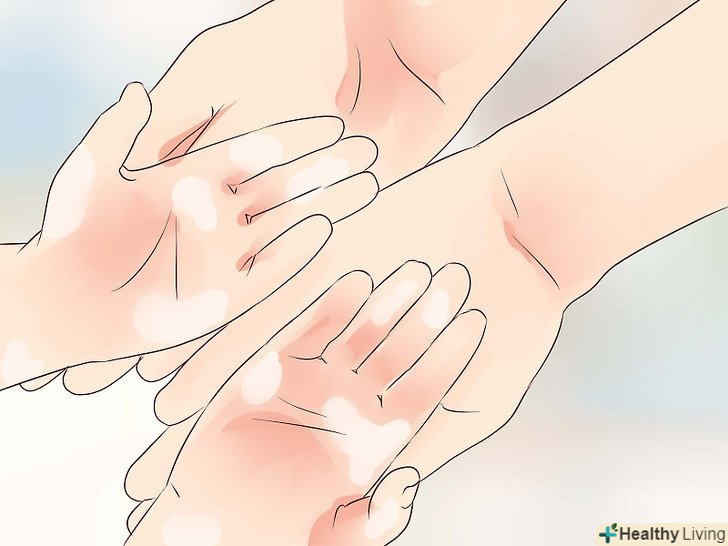 Зверніть увагу на вітіліго.вітіліго-це аутоімунний розлад, який призводить до зниженого рівня шкірного пігменту меланіну. Меланін надає колір волоссю, шкірі і очам людини. При цукровому діабеті першого типу в організмі виробляються аутоантитіла, які руйнують меланін. В результаті на шкірі з'являються білі плями.[19]- Хоча при діабеті першого типу вітіліго розвивається не дуже часто і далеко не відразу, якщо у дитини з'явилися білі плями на шкірі, варто перевірити, чи немає у нього діабету.