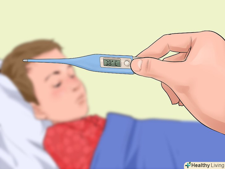 Контролюйте температуру за допомогою термометра.Вам слід контролювати температуру тіла дитини. Регулярно вимірюйте температуру, щоб контролювати будь-які зміни в стані дитини. Дотримуйтесь рекомендацій, викладених в інструкції, що додається до термометра.[21]- Ніколи не використовуйте оральний термометр, якщо дитина перед вимірюванням температури випив або з'їв щось холодне. Результати вимірювання можуть бути неточними.[22]