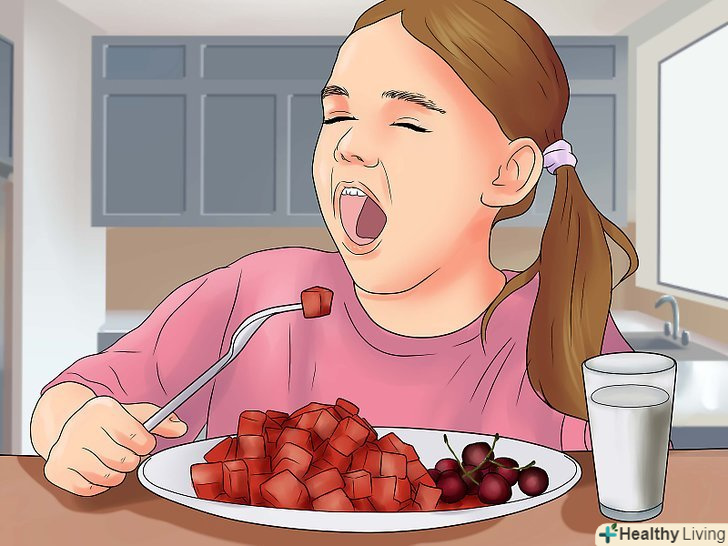 Дайте дитині перекусити якоюсь здоровою їжею.іноді головний біль пов'язаний з рівнем цукру в крові. В цьому випадку невеликий перекус допоможе впоратися з болем.- Відомо, що деякі овочі та фрукти допомагають знизити головний біль. Приготуйте дитині легку закуску зі шпинату, кавуна[11] або вишень.[12]