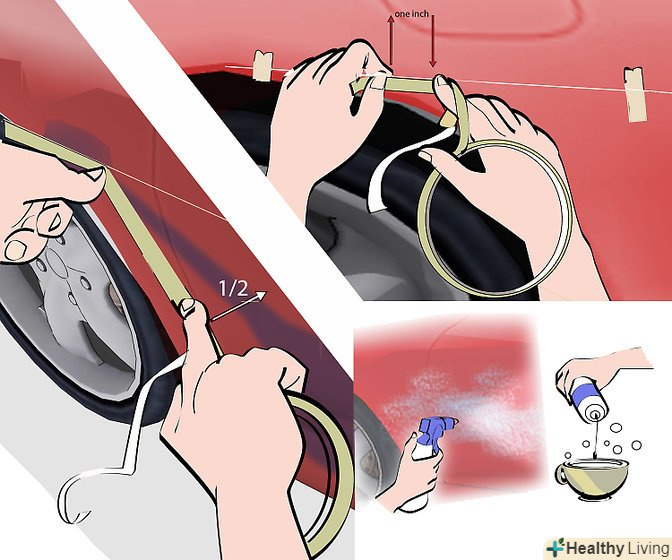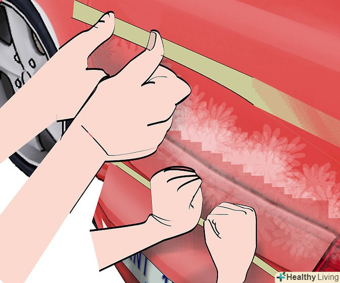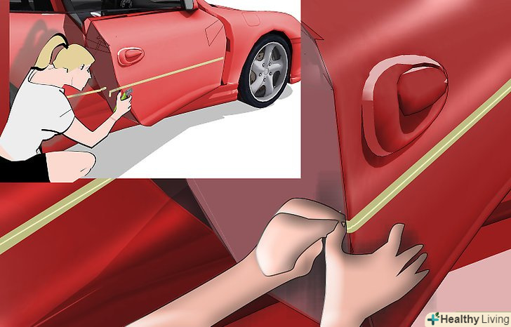 Наклейте перший сантиметр стрічки на передню частину автомобіля, зазвичай на крило.потім відклейте плівку з основи, злегка розтягніть її приблизно до середини кузова автомобіля. Як тільки ви злегка натягнете плівку, ви зможете наклеїти її по прямій лінії. Як тільки ви визначите місце, де хочете наклеїти плівку, починайте повільно підносити її до кузова автомобіля. Декоративна стрічка буде сама злегка приклеюватися до кузова автомобіля в міру того, як ви її підносите до нього.- Якщо ви наклеюєте світловідбиваючу стрічку, то після того, як наклеїте перший сантиметр, нанесіть на кузов автомобіля розчин, що складається з 6 крапель миючого засобу для посуду на 250 мл води. Нанесення цього розчину запобіжить міцне прилипання відбиває стрічки до кузова автомобіля, в іншому випадку, якщо вам потрібно буде її підправити – відклеїти і знову приклеїти – вона може порватися.
