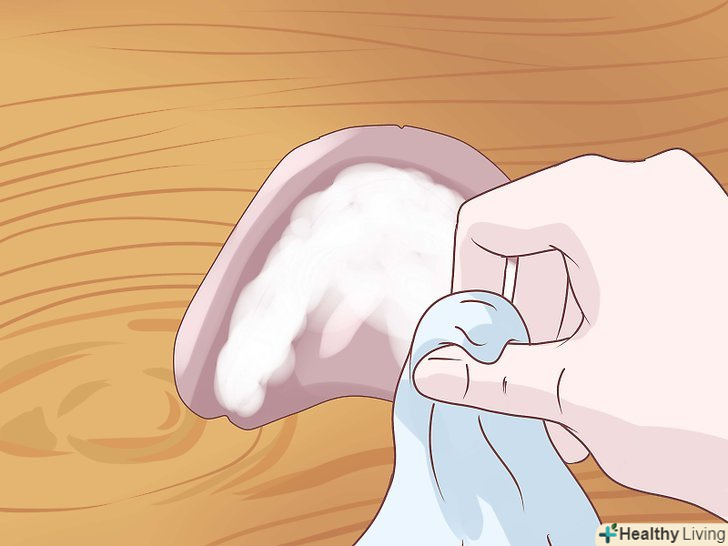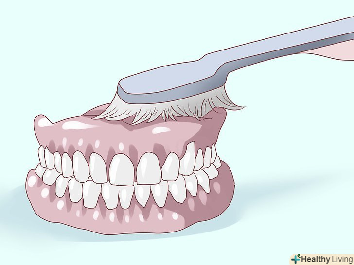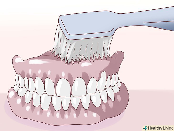 Виберіть правильні інструменти.протези потрібно чистити регулярно, так само як і справжні зуби. Це важливо. При цьому їх потрібно чистити обережно, щоб не пошкодити. Завжди користуйтеся м'якою щіткою або тканиною. І купуйте пасти, виготовлені спеціально для протезів або ж м'яке мило або рідина для миття посуду.- Ніколи не використовуйте щітки середньої жорсткості і зовсім жорсткі, звичайні пасти, сильнодіючі хімікати або чистячі засоби, кислоту, відбілювачі або речовини, які можуть роз'їдати ваш протез.
