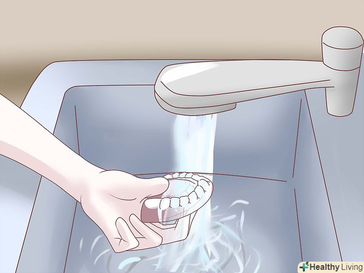 Для початку промийте протез водою.перш ніж переходити до чищення, промийте протез під струменем теплої води. Це допоможе видалити скупчилися залишки їжі.- Якщо у вас немає під рукою інструментів для очищення або ж немає часу чистити протез після кожного прийому їжі, принаймні, промийте його. Це краще, ніж нічого.