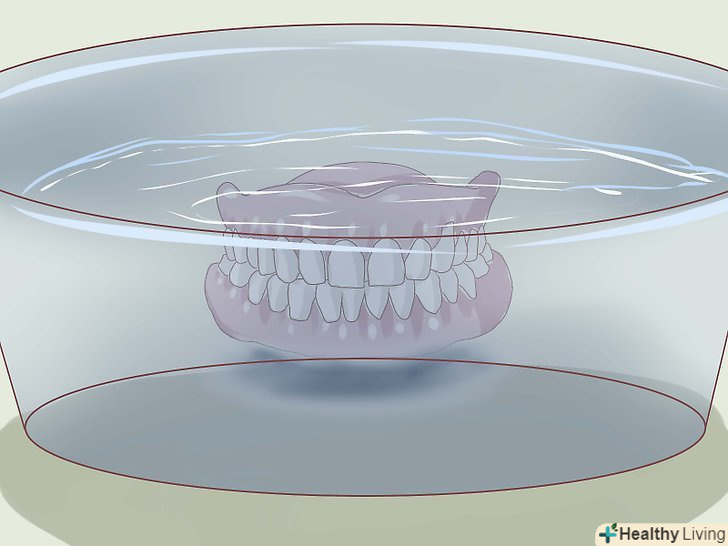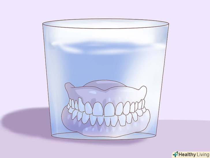 Знімайте протез на ніч.ваші ясна повинні відновлюватися після цілого дня жування і тертя з штучними зубами. Знімайте їх, коли лягайте в ліжко і залишайте їх відмокати в контейнері, наповненому теплою водою.- Ніколи не використовуйте гарячу воду, бо це може призвести до деформації зубних протезів. Уникайте цього, інакше вам доведеться їх викинути через те, що вони зіпсуються.