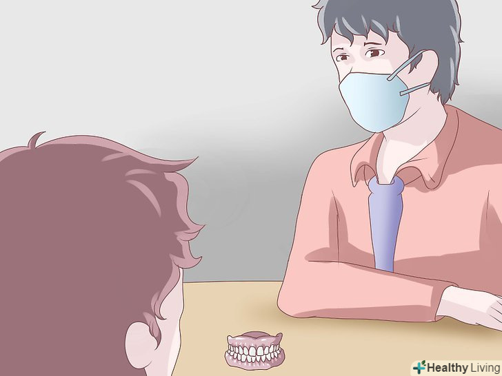 Регулярно відвідуйте стоматолога.незалежно від того, у вас протез на всю щелепу або на її частину, вам необхідно відвідувати стоматолога не рідше, ніж раз на півроку. Він перевірить ваші протези на наявність пошкоджень, а так само відзначить зміни, пов'язані з зубами або яснами. Якщо є якісь проблеми, їх можна вирішити на прийомі у лікаря.- Якщо ваш стоматолог помітить будь-які зміни у вашому обличчі, щелепах, яснах або кістках, йому може знадобитися повторно підганяти протези під Ваші розміри. Це робиться шляхом додавання матеріалу до основи протеза, щоб зробити новий, грунтуючись на залишилися зубах. Крім того, якщо ваш лікар помітить занадто сильний знос або розрив протеза, він може вам порекомендувати виготовити новий.