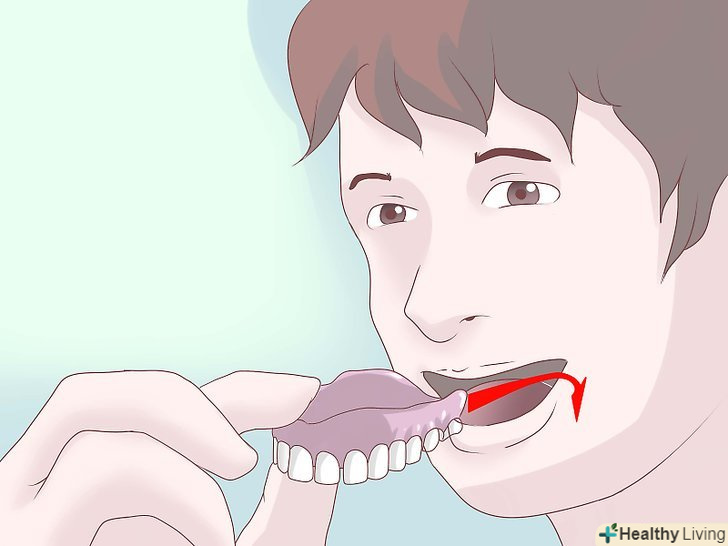 Виймайте протези правильно.існує техніка правильного вилучення протезів, яку багато людей чомусь ігнорують. Видаляйте їх двома великими пальцями, щоб відчувати межі протезів, натисніть злегка на зони, покриті акрилом, які пофарбовані в рожевий колір. Для вилучення верхнього зубного протеза, злегка потягніть його вниз, нижній же слід, навпаки, потягнути вгору. Не намагайтеся стиснути або зігнути протез в процесі вилучення.- Якщо у вас великі за розміром протези або ж маленький рот, постарайтеся відтягнути щоки і, провернувши протез, витягти спочатку одну частину, потім другу.