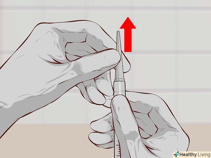 14. Злегка натисніть на поршень.після того як бульбашки повітря виявляться вгорі, трохи натисніть на поршень і витісніть їх зі шприца. Видавіть зі шприца все повітря, поки з голки не вилетить Цівка розчину.[19]