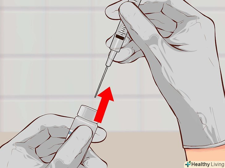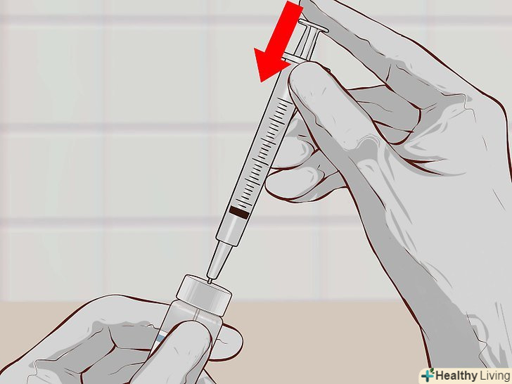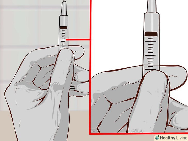 12. Відтягніть поршень назад.якщо ви правша, своєю правою рукою відтягніть поршень до мітки, яка відповідає необхідній дозі. При цьому голка повинна залишатися в ампулі.[17]