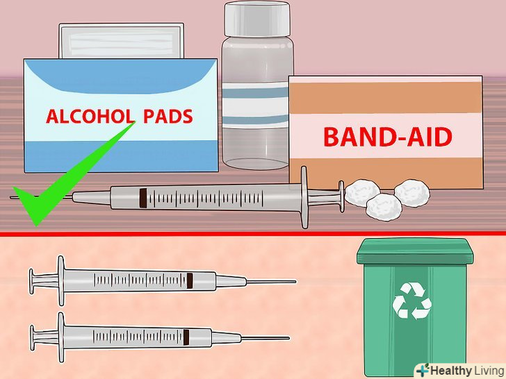 1. Зберіть все необхідне.вам знадобляться флакон з ліками, шприц, спиртові серветки, ватяну кульку, лейкопластир і контейнер для медичних відходів.[1]