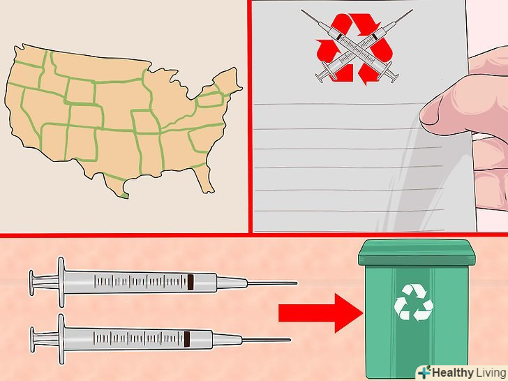 2. Ознайомтеся з місцевими правилами.у кожній державі існують правила і рекомендації, які регулюють збір і утилізацію біологічно небезпечних відходів. Використані гострі предмети, в тому числі голки і шприци, вважаються біологічно небезпечними відходами, оскільки вони безпосередньо контактували зі шкірою і кров'ю пацієнта.[25]