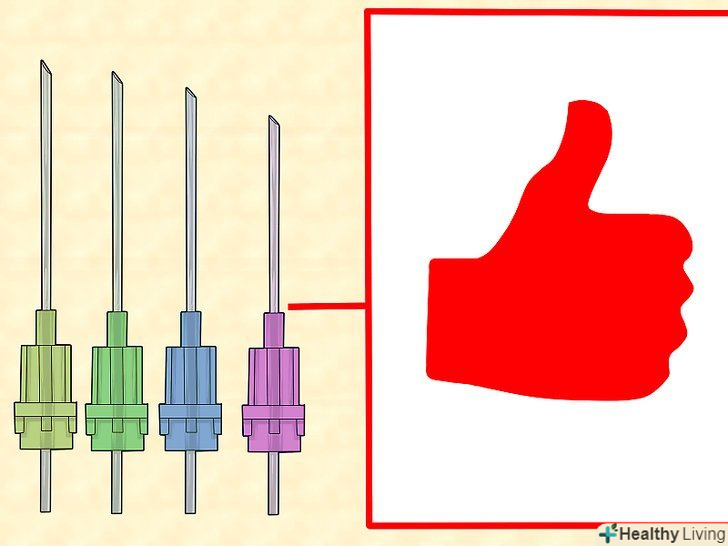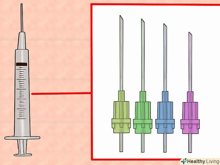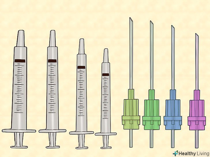 10. Виберіть відповідні голку і шприц.в даний час багато препаратів для ін'єкцій продаються разом з усім необхідним, в тому числі зі шприцом і голкою.[39]