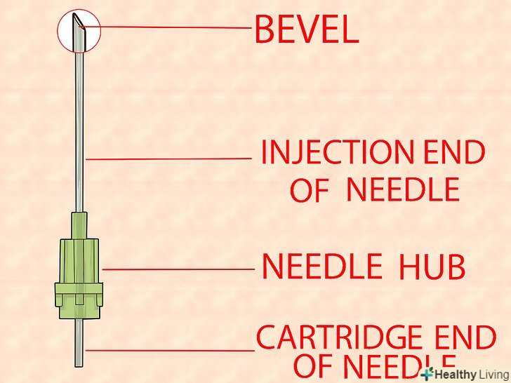 9. Ознайомтеся з пристроєм голки.голка приєднується до наконечника шприца і також складається з трьох частин. Це насадка з різьбленням, стрижень і скошене вістря.[38]