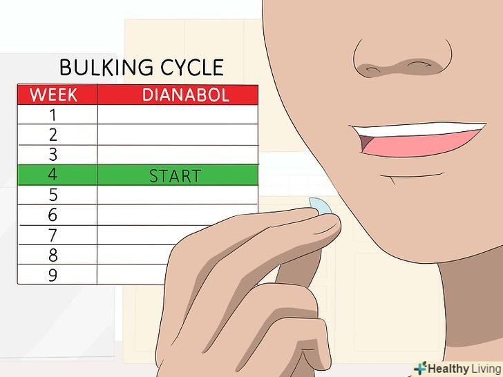 Почніть приймати Дианабол з початку або в середині 4-6 тижневого циклу.багато людей приймають Дианабол на початку періоду набору маси, щоб запустити режим і почати швидко нарощувати м'язи. Інші ж чекають до середини циклу, коли вони досягають межі і перестають нарощувати масу. Обидва методи ефективні, так що віддайте перевагу тому, який краще підходить для вашого організму і режиму тренувань.[2]- Для досягнення найкращих результатів не починайте приймати Дианабол пізніше третього тижня періоду набору м'язової маси.