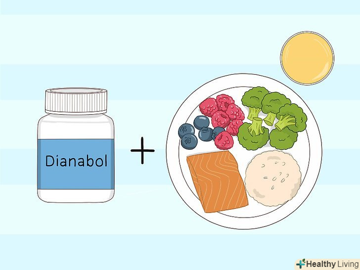 Приймайте Дианабол разом з їжею, щоб уникнути розладу шлунка.Дианабол іноді супроводжується нудотою та іншими проблемами зі шлунком. Тим не менш, їх можна пом'якшити, приймаючи стероїд разом з їжею. Деякі люди також повідомляють про виникнення втоми після прийому Дианабола на порожній шлунок, так що прийом під час їжі — це хороший спосіб зробити так, щоб під час тренувань ви були повні сил.- Немає ніяких конкретних продуктів, які необхідно їсти під час прийому Дианабола. Але оскільки це швидкодіючий стероїд, можливо, Вам варто віддати перевагу їжі з високим вмістом білків, щоб препарату було з чого нарощувати м'язову масу.