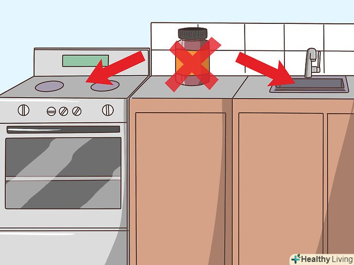 Не тримайте їх поруч з духовкою або раковиною. Кухня може бути хорошим місцем для зберігання вітамінів і добавок, але в кухні дуже часто з'являється вологість і випаровування жиру в повітрі від приготування їжі, які осідають на таблетках. Температура і вологість на кухні піднімається і опускається, коли ви використовуєте духовку або плиту.- Кухонна раковина-це ще одна область, в якій утворюється багато вологи.