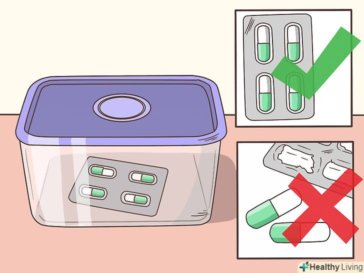 Використовуйте герметичний контейнер.щоб уникнути вологи, Ви можете зберігати свої вітаміни та добавки в герметичному контейнері. Не виймайте їх з оригінальної упаковки, а помістіть весь пакет в герметичний контейнер.- Непрозорий контейнер підійде, але ви також можете використовувати флакон для реактивів. Ці темніші контейнери також можуть захищати вітаміни від світла.[6]